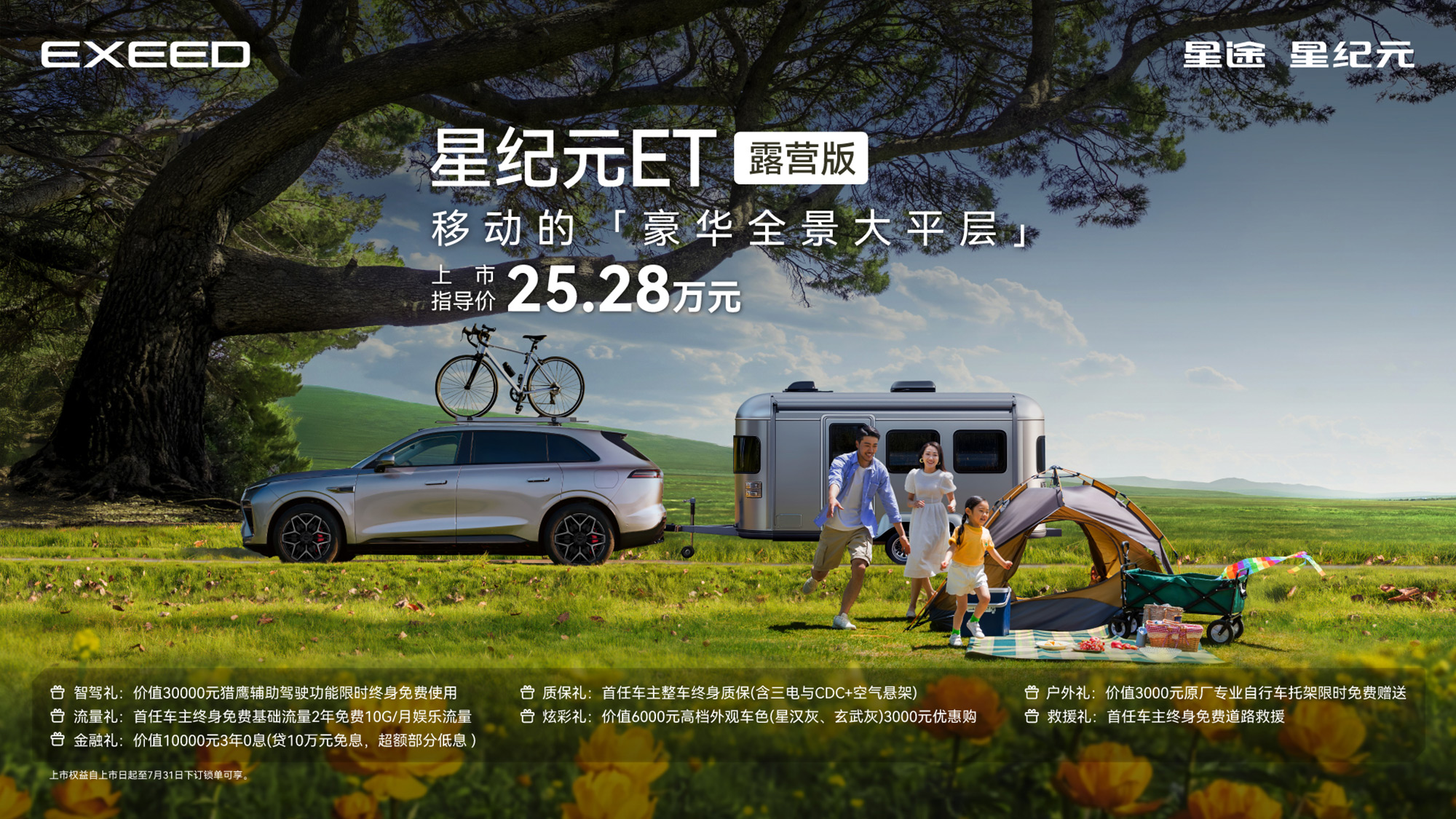 伴随EXEED Rider的亮相,星途同步推出星纪元ET露营版,官方指导价为25.28万元,并推出价值30000元猎鹰辅助驾驶功能限时终身免费使用,价值3000元原厂专业自行车托架限时赠送等多重好礼。这款集“科技新豪华”理念之大成的C级SUV,以豪华大平层空间、远行三件套“黄金增程+飞鱼底盘+雪豹四驱”,全场景安全守护及丰富出行生态,成就用户探索广阔天地的“移动生活搭子”与最适合露营的SUV。